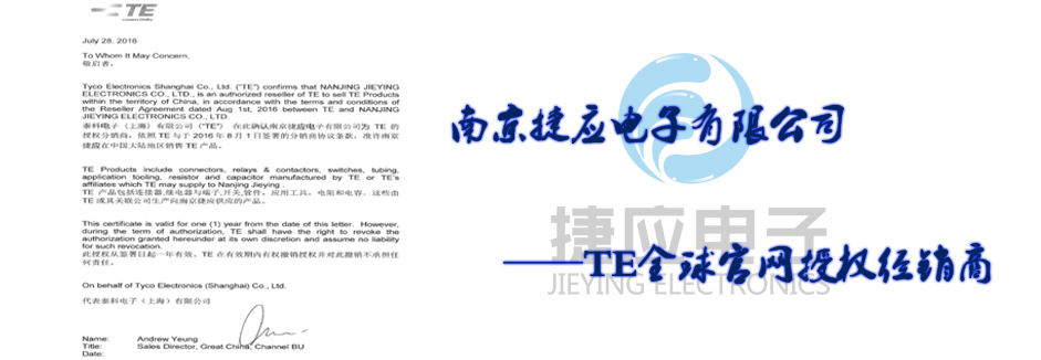 南京捷應電子有限公司是國際無源器件品牌美國泰科電子(TE)在中國華東地區(qū)的主要通路商,代理經(jīng)銷旗下全系列產(chǎn)品包括TYCO(AMP)系列連接器、接插件、OEG、SCHRACK、P&B功率繼電器、美國RACHEM各類航空導線、熱縮套管、模縮套、標識產(chǎn)品、電線電纜。